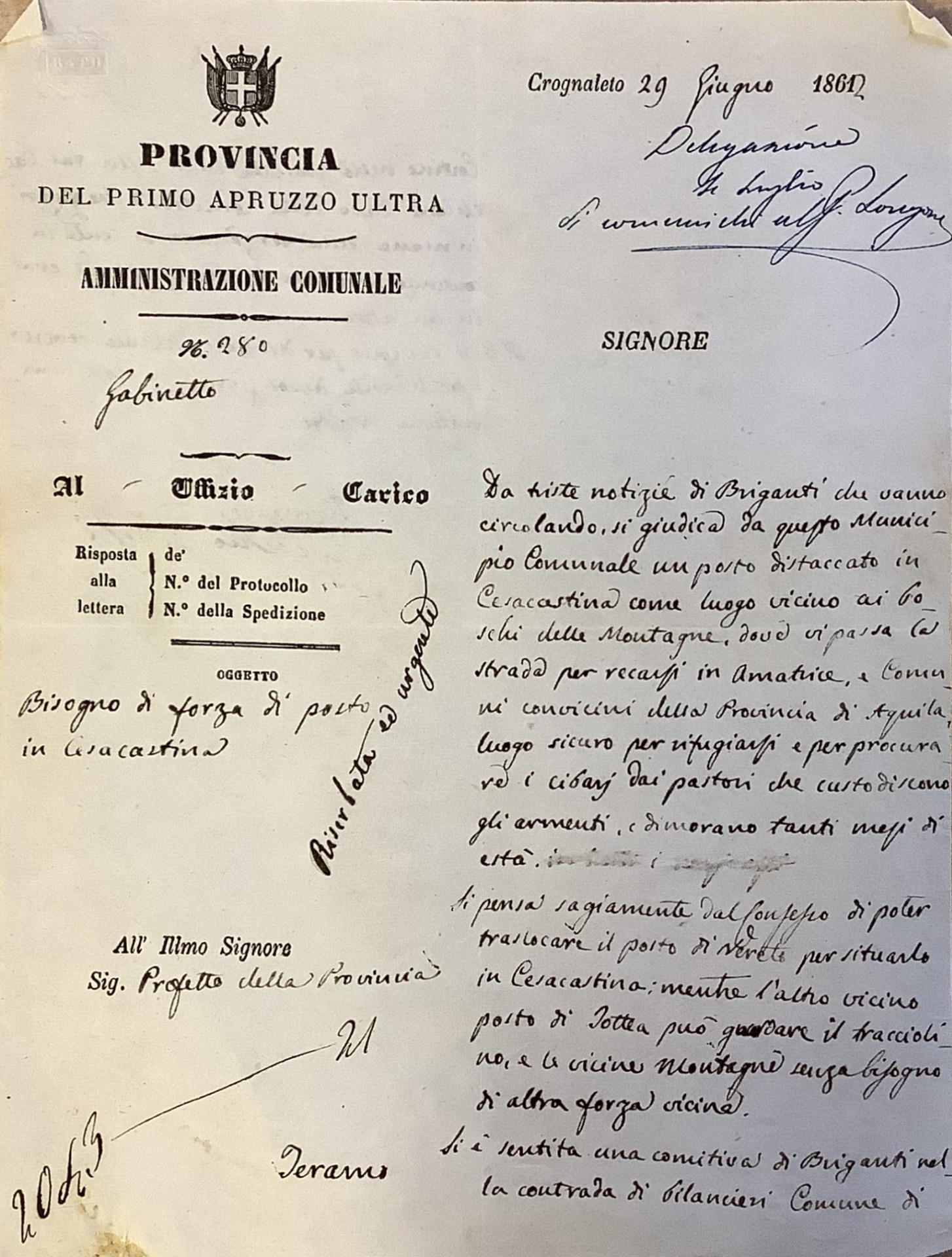 Sabato 29 giugno 1862 il Sindaco di Crognaleto Eustachio Ridolfi invia al Prefetto della Provincia di Teramo, la richiesta urgente di una forza di presidio nella frazione di Cesacastina. Il Sindaco segnala il grave pericolo rappresentato dalle scorribande dei briganti che infestano la zona montana. L'amministrazione comunale ha ritenuto indispensabile stabilire un posto distaccato a Cesacastina, poiché la località è situata in una posizione strategica a ridosso dei boschi e sulla via di comunicazione verso Amatrice e i comuni limitrofi della Provincia di Aquila. Tale conformazione geografica ha reso il borgo un rifugio ideale per i malviventi, i quali possono facilmente approvvigionarsi di viveri presso i pastori che durante i mesi estivi dimorano in quota con gli armenti. Per far fronte a tale minaccia, il Sindaco propone di traslocare il posto di guardia di Nerito a Cesacastina, ritenendo invece che il vicino presidio di Tottea sia sufficiente a sorvegliare le vette circostanti senza ulteriore ausilio. La preoccupazione è alimentata dall'avvistamento di una comitiva di briganti nella contrada di Bilancieri, nel territorio di Cortino, avvenuto nella notte precedente, e dalla presenza segnalata del famigerato brigante "Cacchione", capo della banda che è sfuggito alla cattura e continua a vagare instancabilmente tra i monti. Il testo si conclude con un appello formale affinché vengano adottate disposizioni immediate, sottolineando la gravità della situazione, l'insicurezza della popolazione e il difficile corretto assolvimento dei doveri istituzionali.