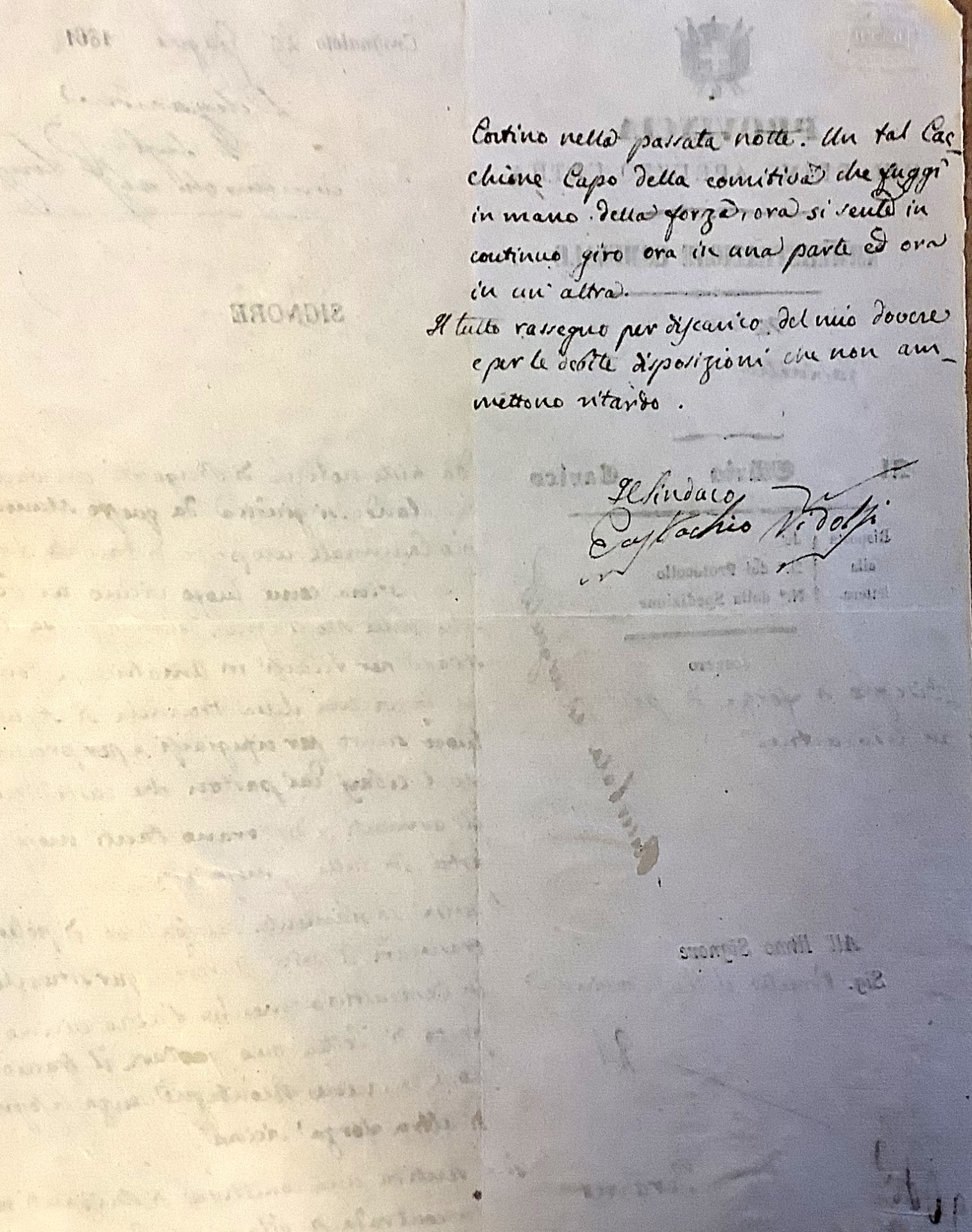 Sabato 29 giugno 1862 il Sindaco di Crognaleto Eustachio Ridolfi invia al Prefetto della Provincia di Teramo